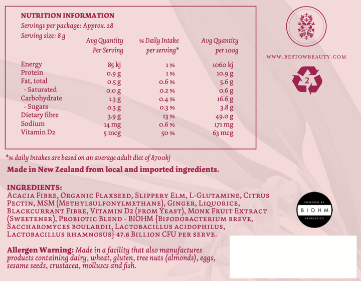 Our gut is a complex ecosystem of bacteria and fungi, and when this balance is disrupted by poor diet, stress, or illness, it can lead to a range of gut-related and skin-related concerns. Bestow Gut Love + is designed to restore that balance, helping you address the root cause of skin issues by healing and nourishing the gut.