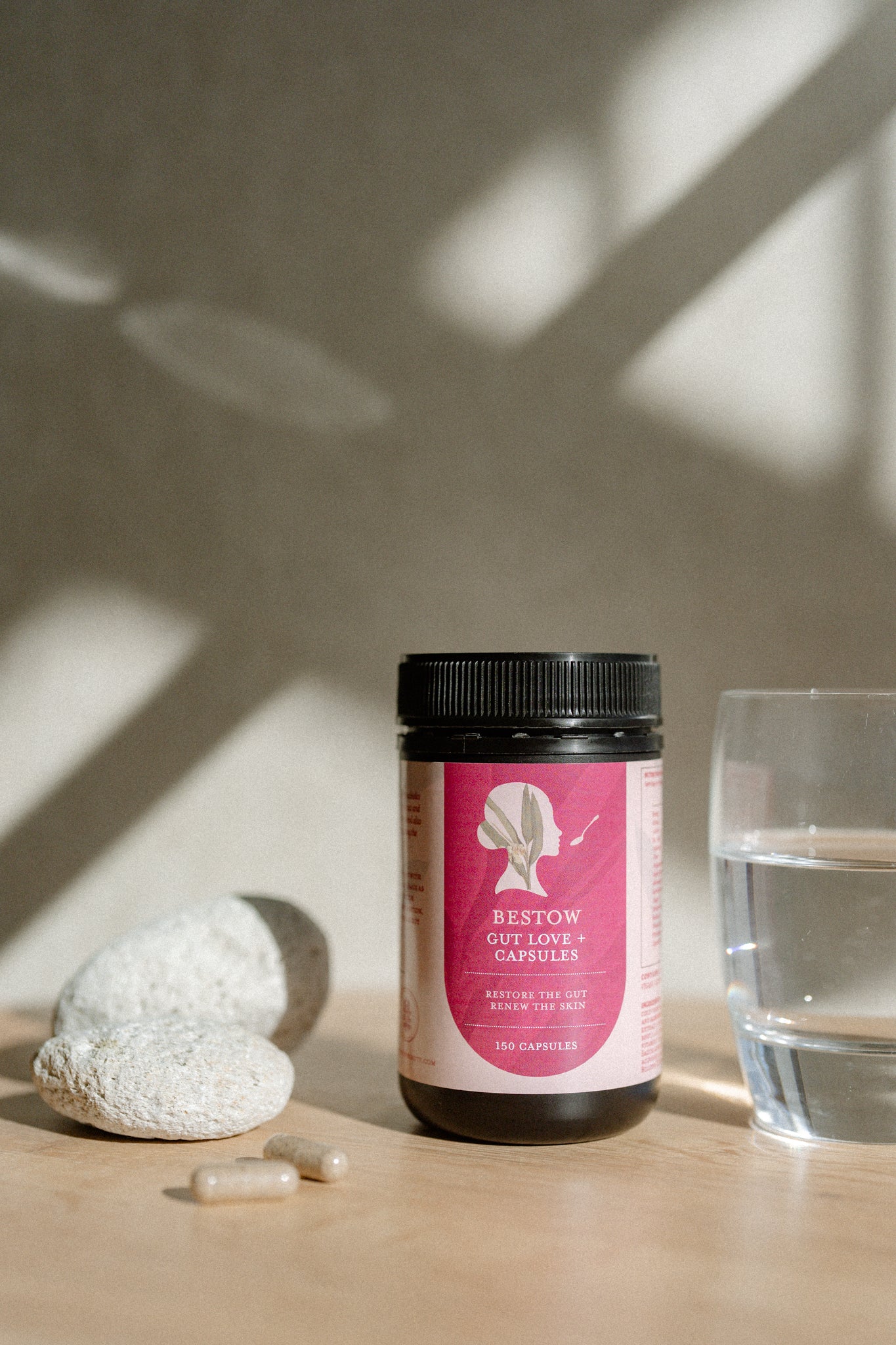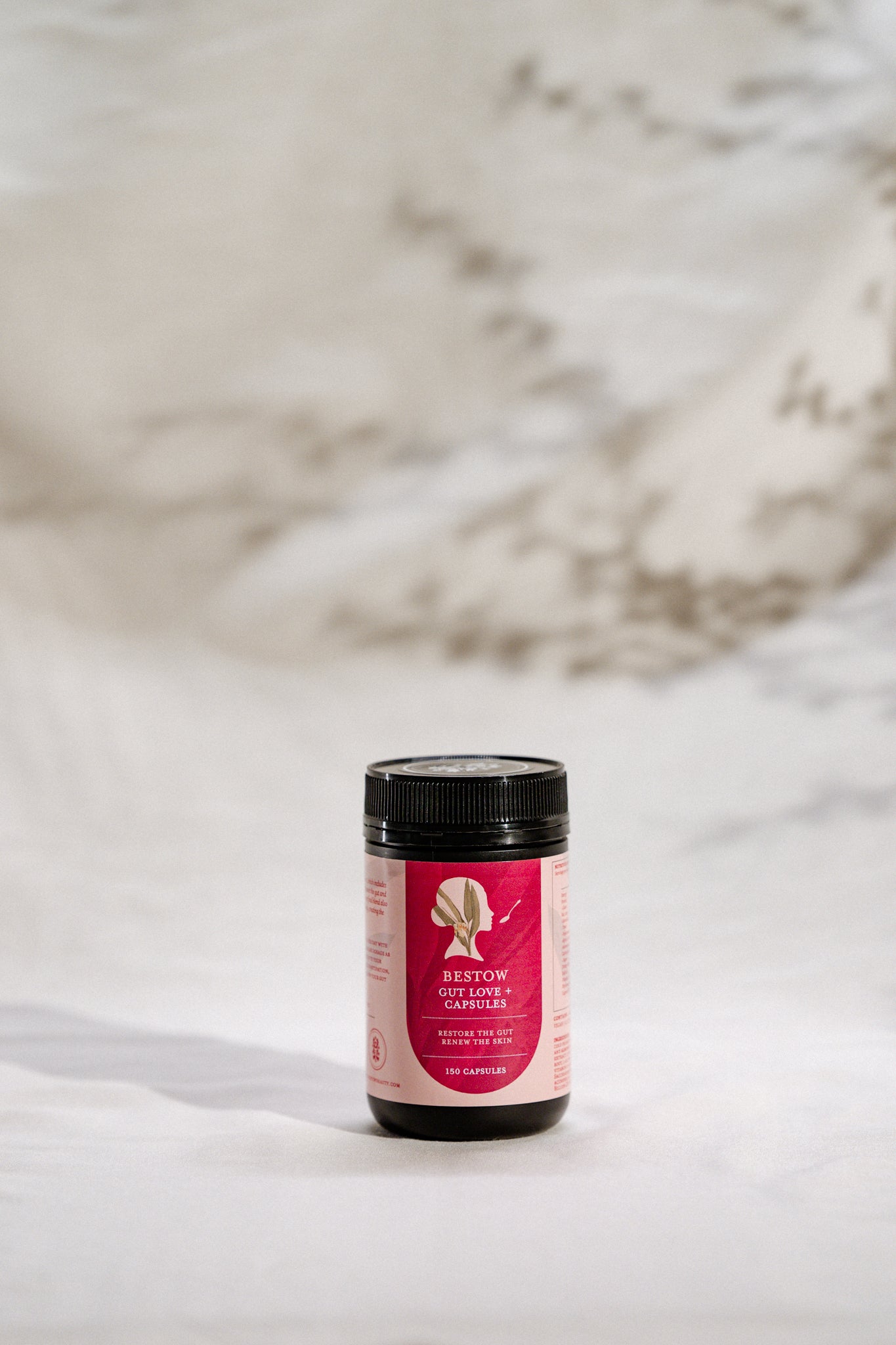 Bestow Gut Love + Capsules offer a convenient way to support your gut health and, in turn, your skin and overall wellbeing. Crafted in Aotearoa, New Zealand, this thoughtfully formulated supplement contains a powerful blend of fibre-rich foods, probiotics, prebiotics, digestive enzymes, fungi, and gut-repairing nutrients.