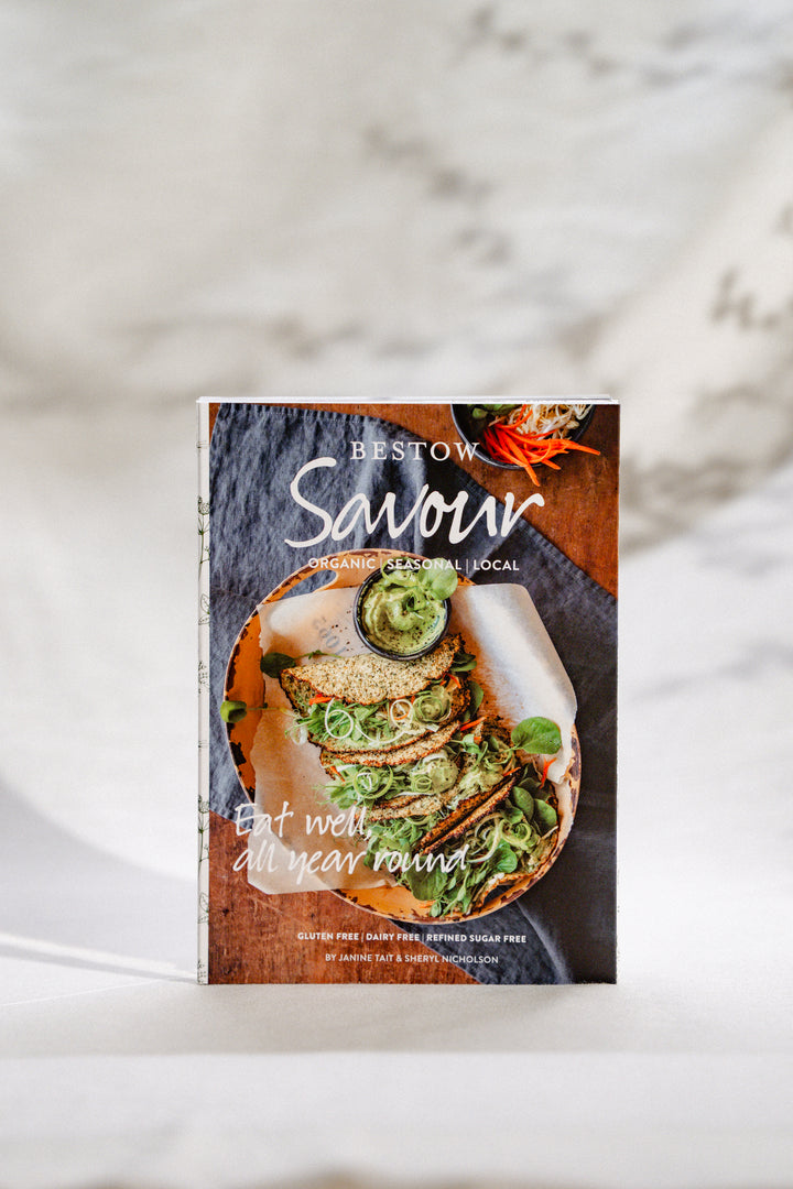 Savour is a nourishing, plant-based recipe book created by Janine Tait and Sheryl Nicholson. Designed to help you embrace the beauty of vegetarian cooking, this collection of one-dish savoury meals celebrates organic, locally grown, seasonal produce.